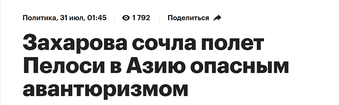 扎哈罗娃当天在Telegram上先是写道:“一方面,(我)想说佩洛西的出行是危险的军事政治冒险主义行为。另一方面,这次出行是‘混淆了梦境与现实’,发生的与这位美国政客有关的一切是如此的不正常且超现实。”扎哈罗娃并未明确说明自己指的是佩洛西出行去哪里,不过塔斯社和《俄罗斯商业咨询日报》在报道中称,她指的是佩洛西的亚洲行。